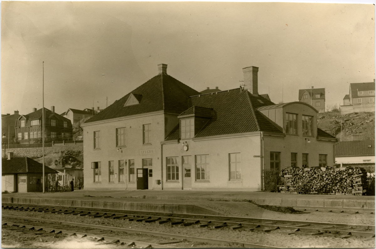 Titel: Stationshus med upplag av meterved avsedd för uppvärmning.