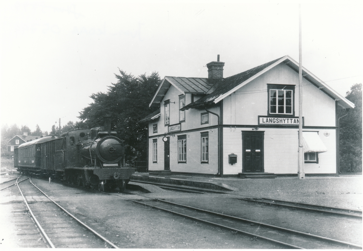 Långshyttan station. På spåret står Byvalla-Långshyttan Järnvägs ånglok BLJ lok 5 "Thor" med tåg. Loket tillverkat 1909.