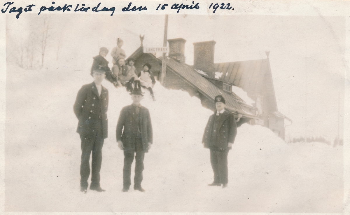 Titel: Lekande barn i snödriva. Station anlagd 1893. En- och en halvvånings stationshus i trä.