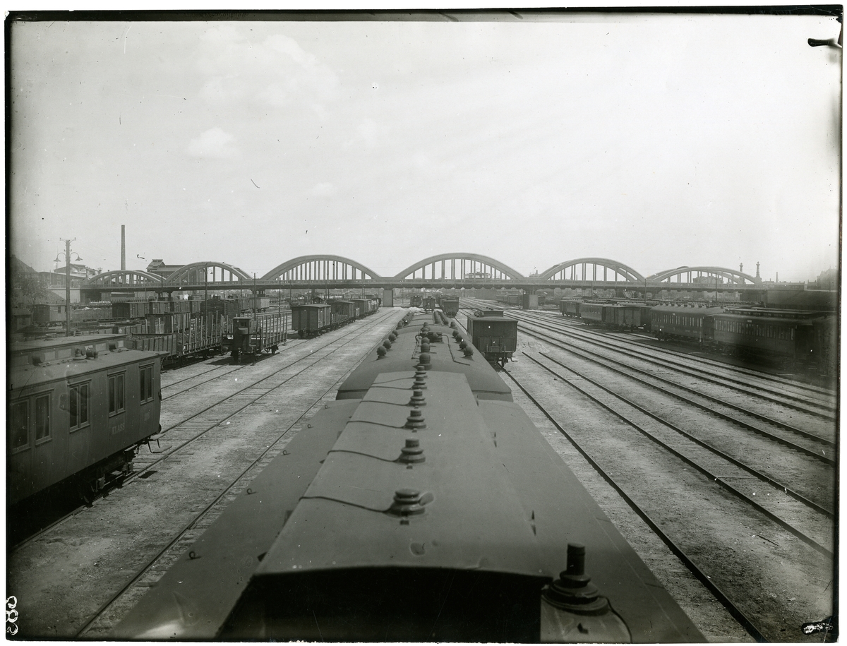 Text på fotot Gatuviadukt över bangården i Malmö. Järnvägsspåren ombyggda 1931-1932. Ny bild bör tagas. Vyn tagen från söder.
