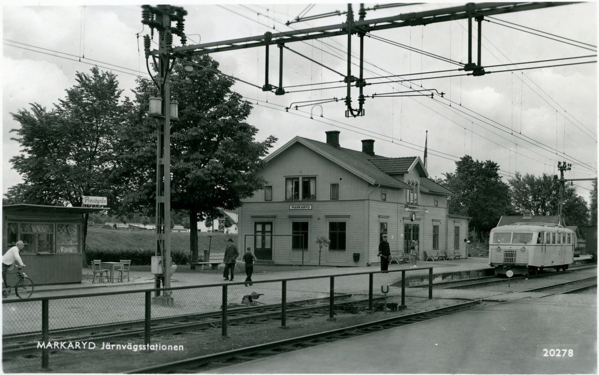 Titel: Markaryd stationshus med rälsbuss vid plattform.