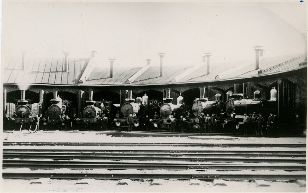 Motala verkstad. Fältmanövern 1899. Från vänster SJ B 53 Forsete, SJ Da 347, SJ Kd 397, SJ I 118 "Hilding", SJ Kd2 451, SJ Kd 389.