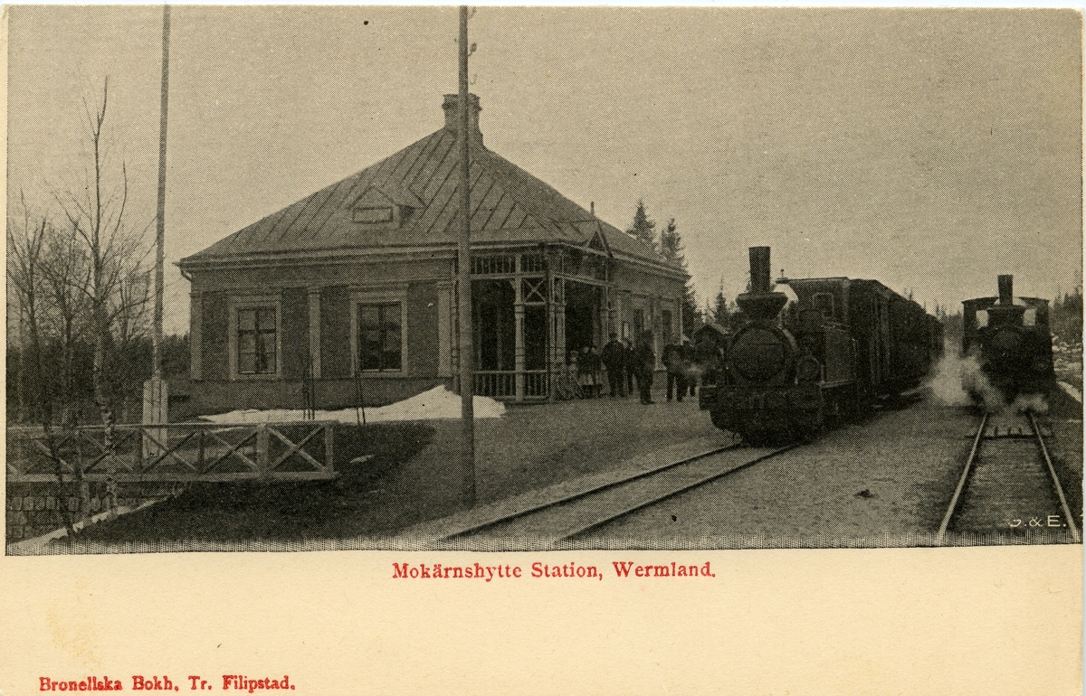 Titel: Vykort med texten Mokärnshytte Station Wermland. Bronellska bokhandeln Trafikplats Filipstad.