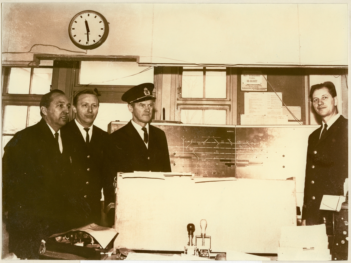 Personal visar nytt ställverk modell 65. Från vänster: Rolf Sundman, Tore Jansson, Stig Hjort, stationsmästare och Arne Glans
