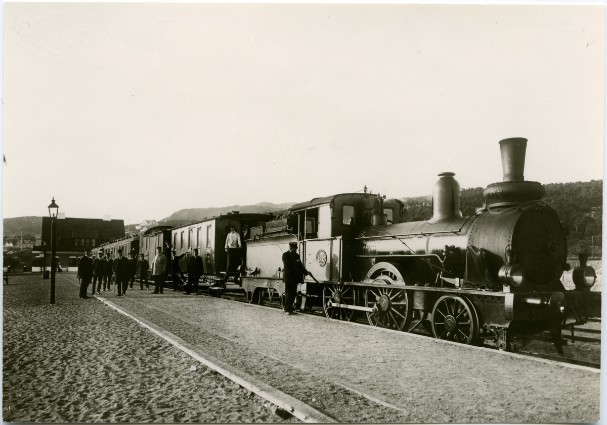 Statens Järnvägar, SJ VKBa2 483, ursprungligen Göteborg Hallands Järnväg, GHB lok 5, med tåg. Loket tillverkades 1891av Nohab, Nydqvist & Holm.