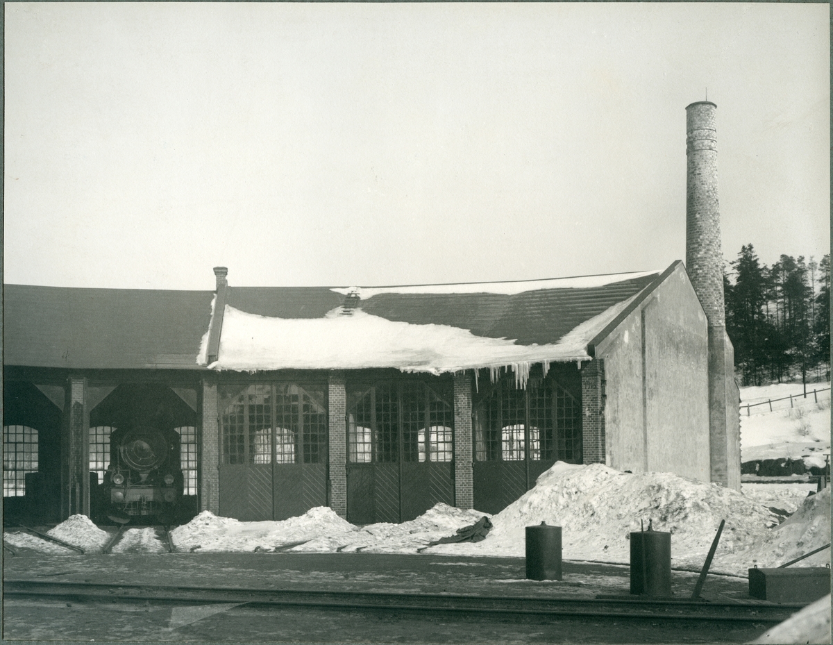 Titel: Lokstallar med snö på taket. Text på bilden - Tre nya lokstallar i Nässjö uppförda 1915.