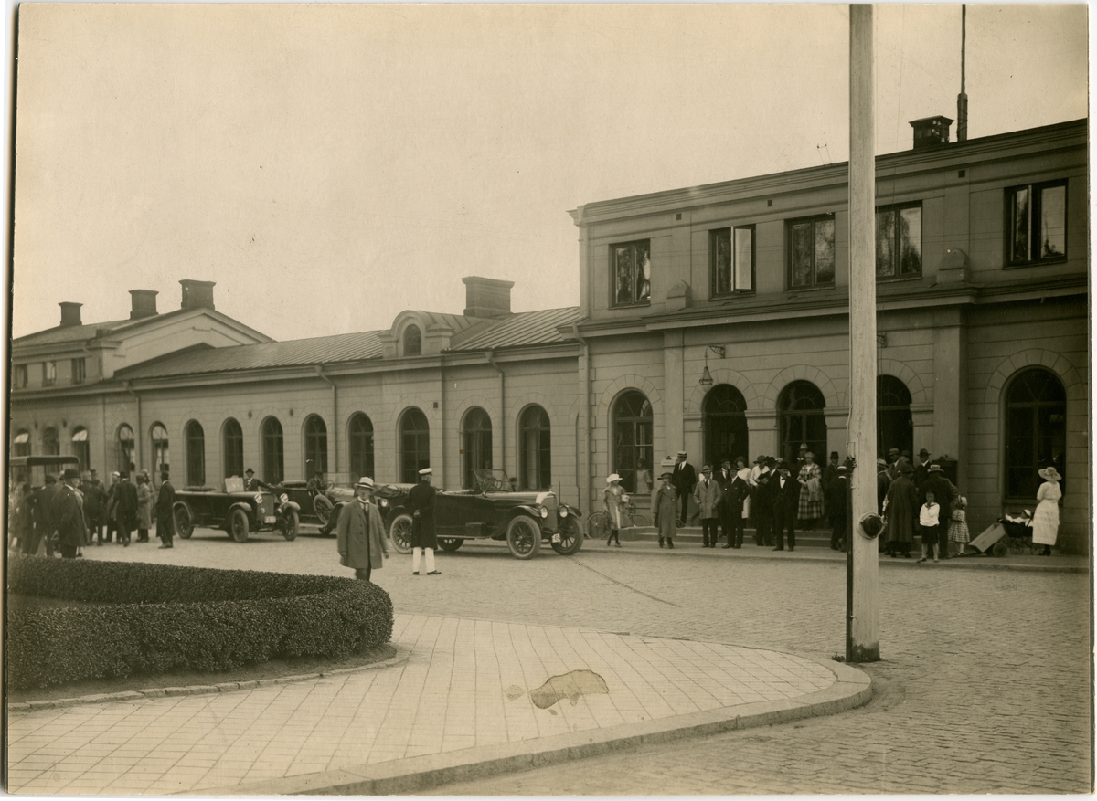 Titel: Nässjö station från gatusidan. Bilar och resande.