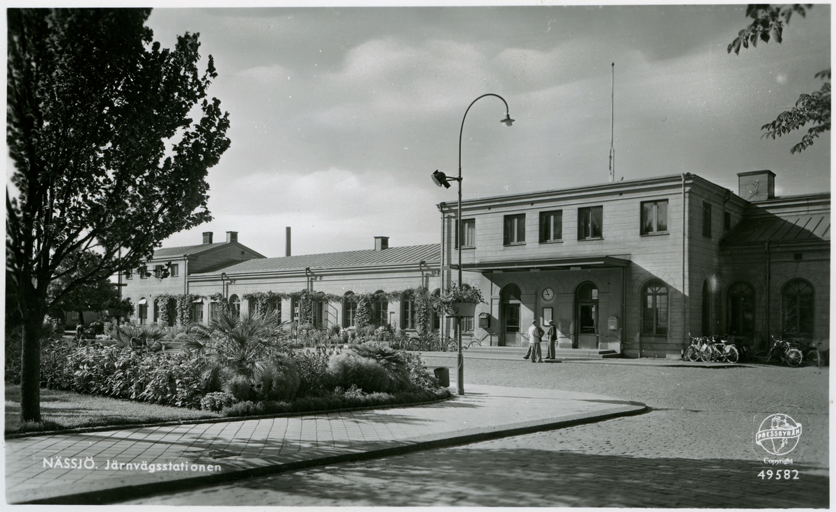 Titel: Kopia av Pressbyråns vykort 49582. Nässjö. Järnvägsstationen från gatusidan.