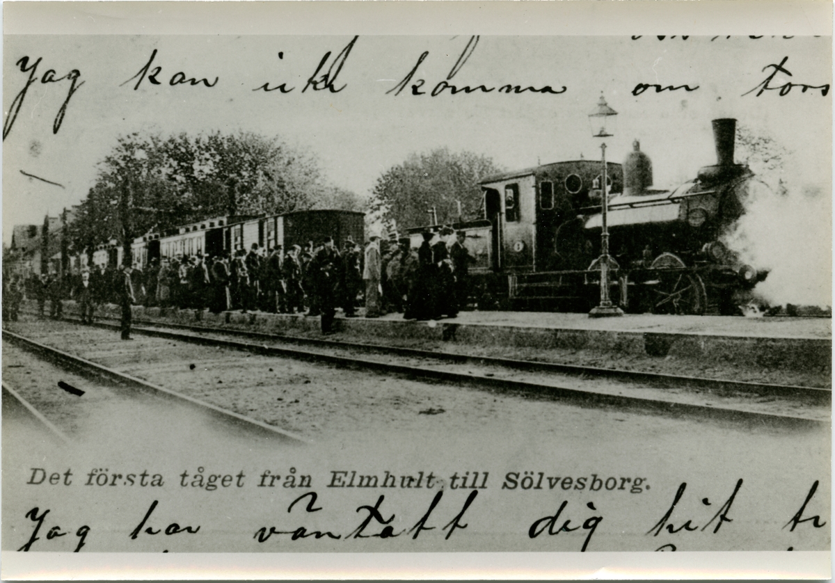 Första tåget från Älmhult till Olofström 1900. Troligen handlar det om provkörning. Eftersom Sölvesborg - Olofström - Älmhults Järnvägen öppnades 1901 för allmän trafik.