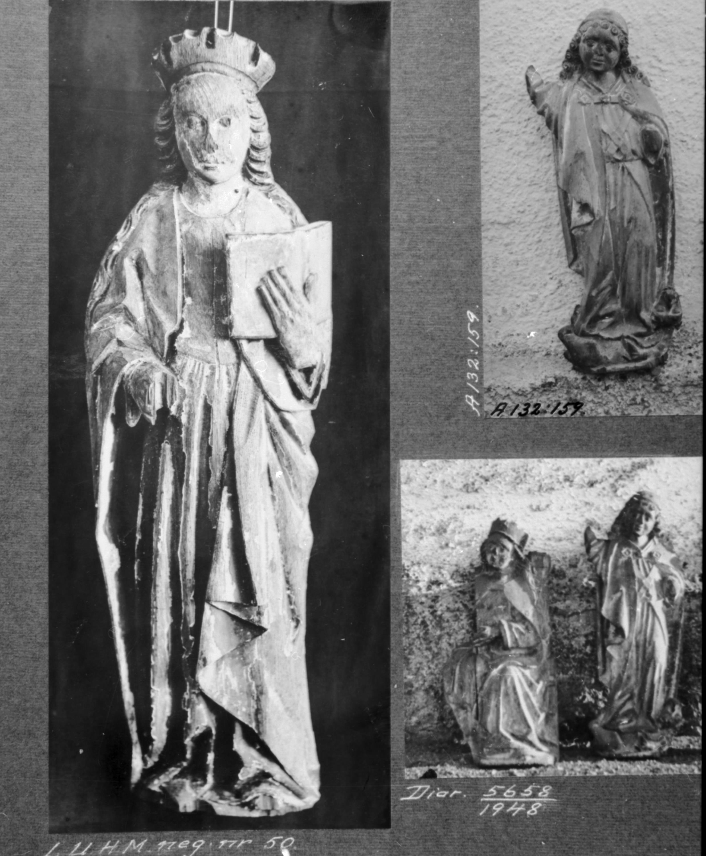 Skulptur, krönt kvinnligt helgon med bok från 1400-talets andra hälft.