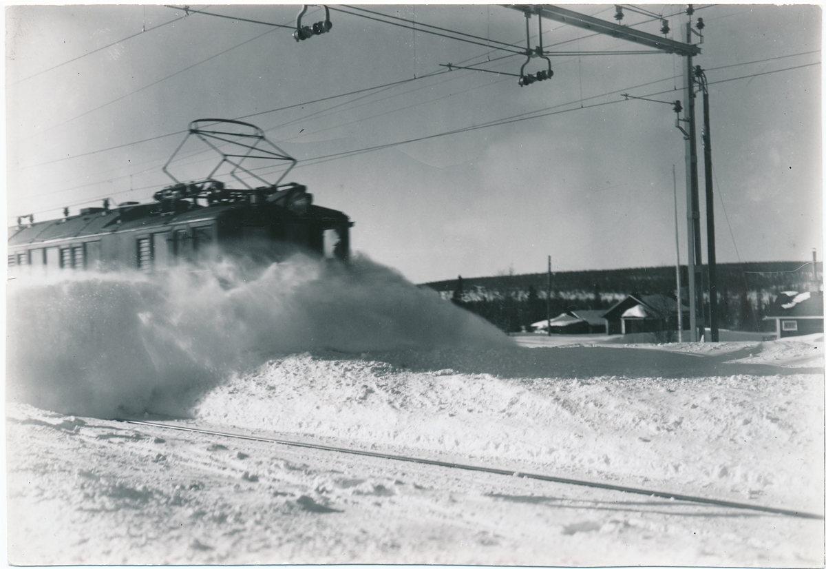Statens Järnvägar, SJ. Godståg på ingång på Risbäcks bangård efter tre dagars snöfall 1934.