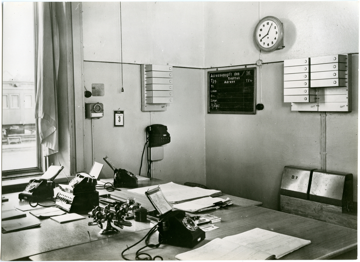 Titel: LM Ericsson kopplingsboxar för telefon. Skrivbord med telefoner.