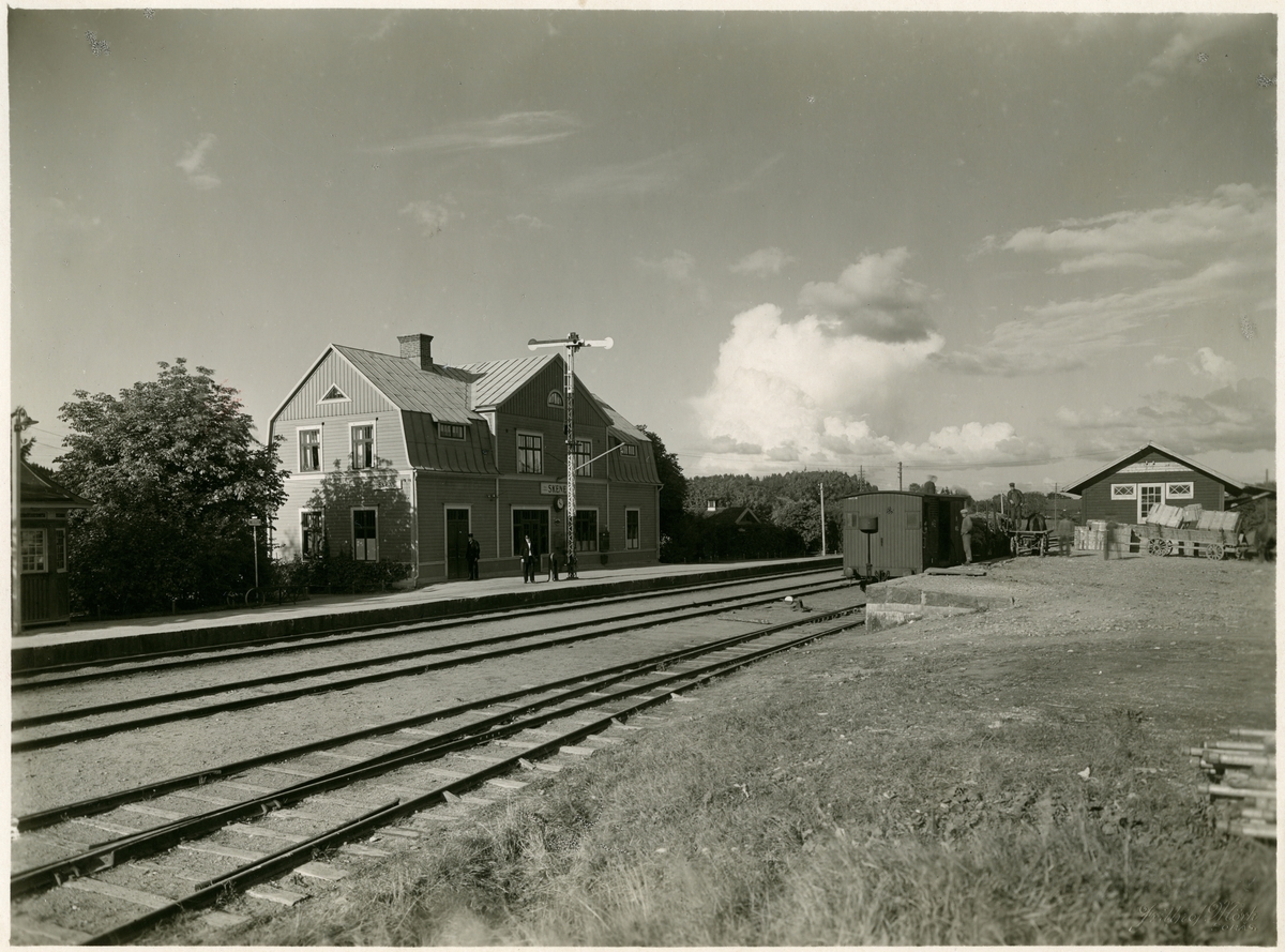 Titel: Skene station från tågsidan. Personal utanför stationshuset.