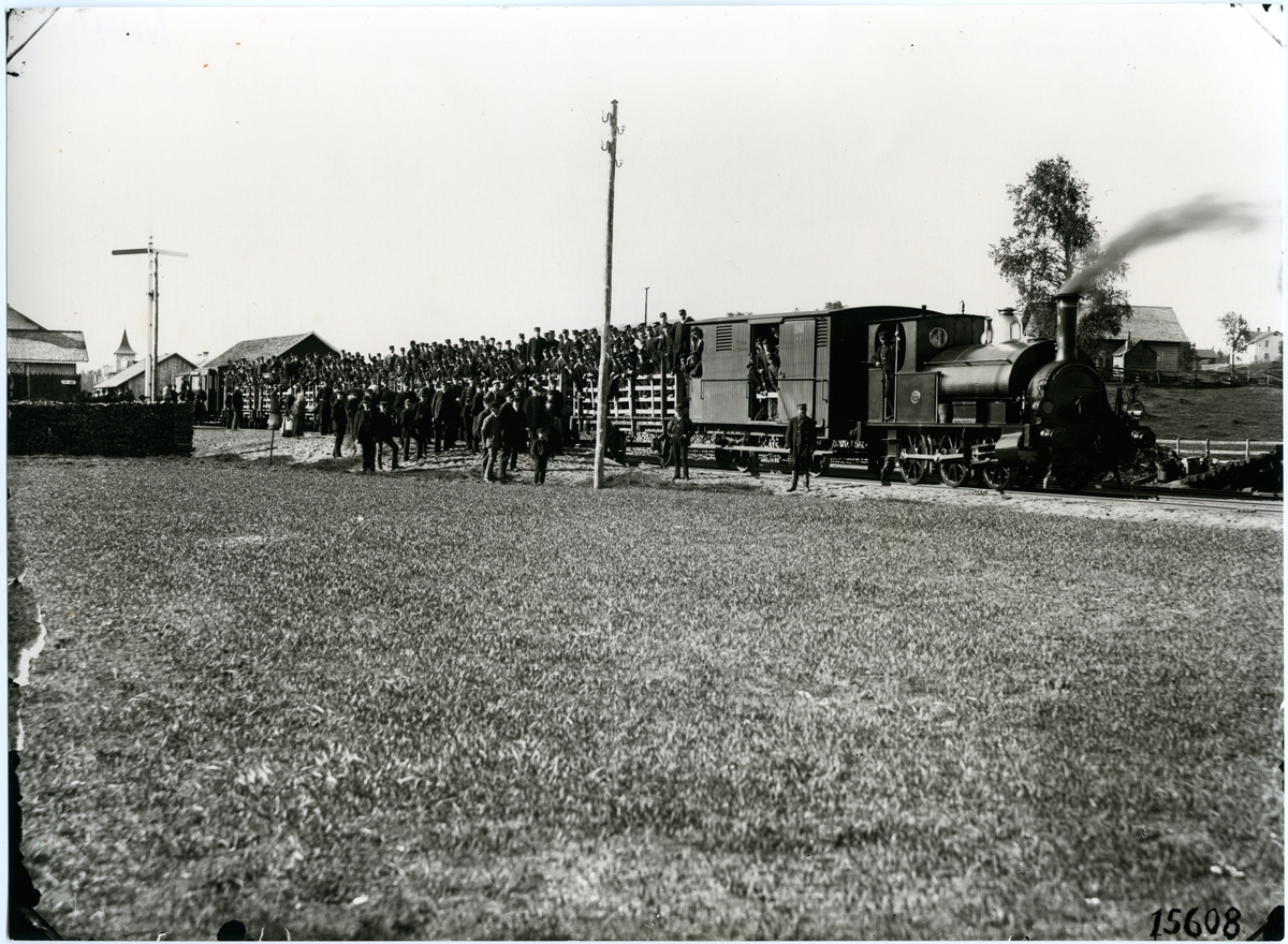 Text på bilden - Skillingaryd. Beväringstransport på HNJ första år omkring 1878.HNJ lok 4. HNJ lok 4 hette Wernamo.