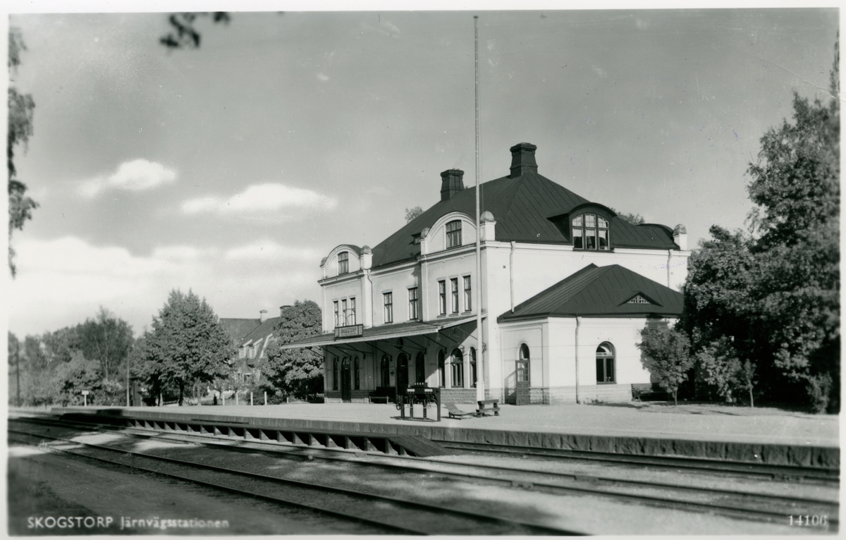 Titel: Kopia av Pressbyråns vykort 14106 av Skogstorps station. Banan elektrifierades 1953.