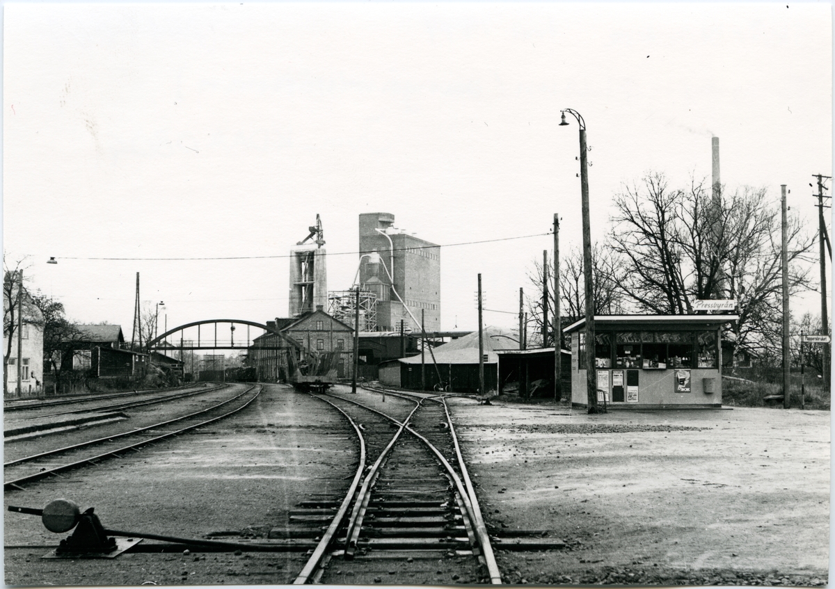 Bangården med fabrik i bakgrunden.