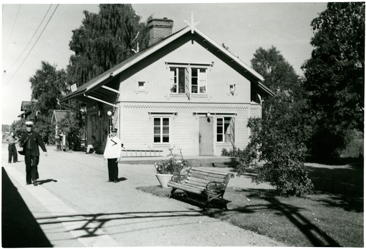 Titel: Skästra station med resande och personal på plattformen. Sommar.