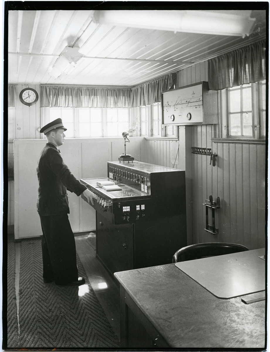 Titel: Det elektriska ställverket med tågklarerare N. Karlsson på Stocksund station.