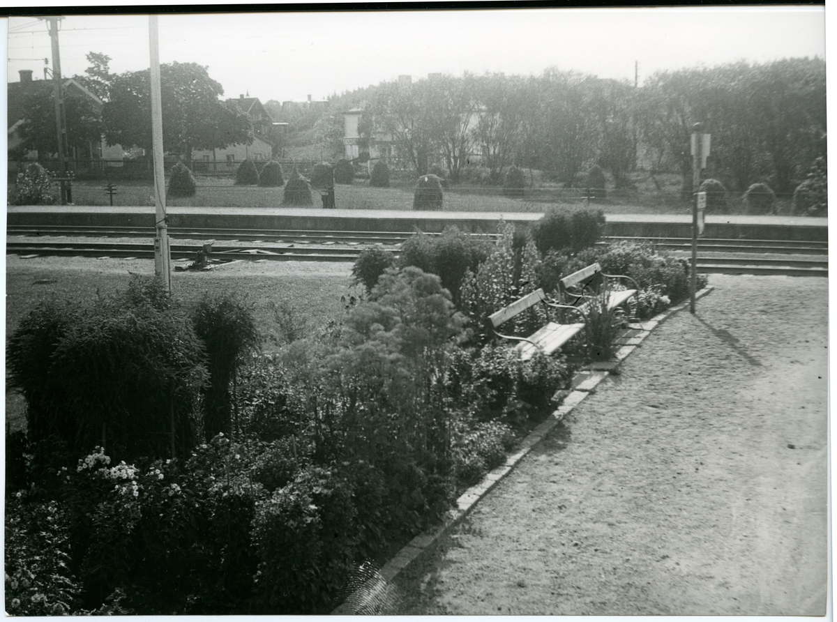 Titel: Plantering och parkbänkar vid Vagnhärad järnvägsstation.