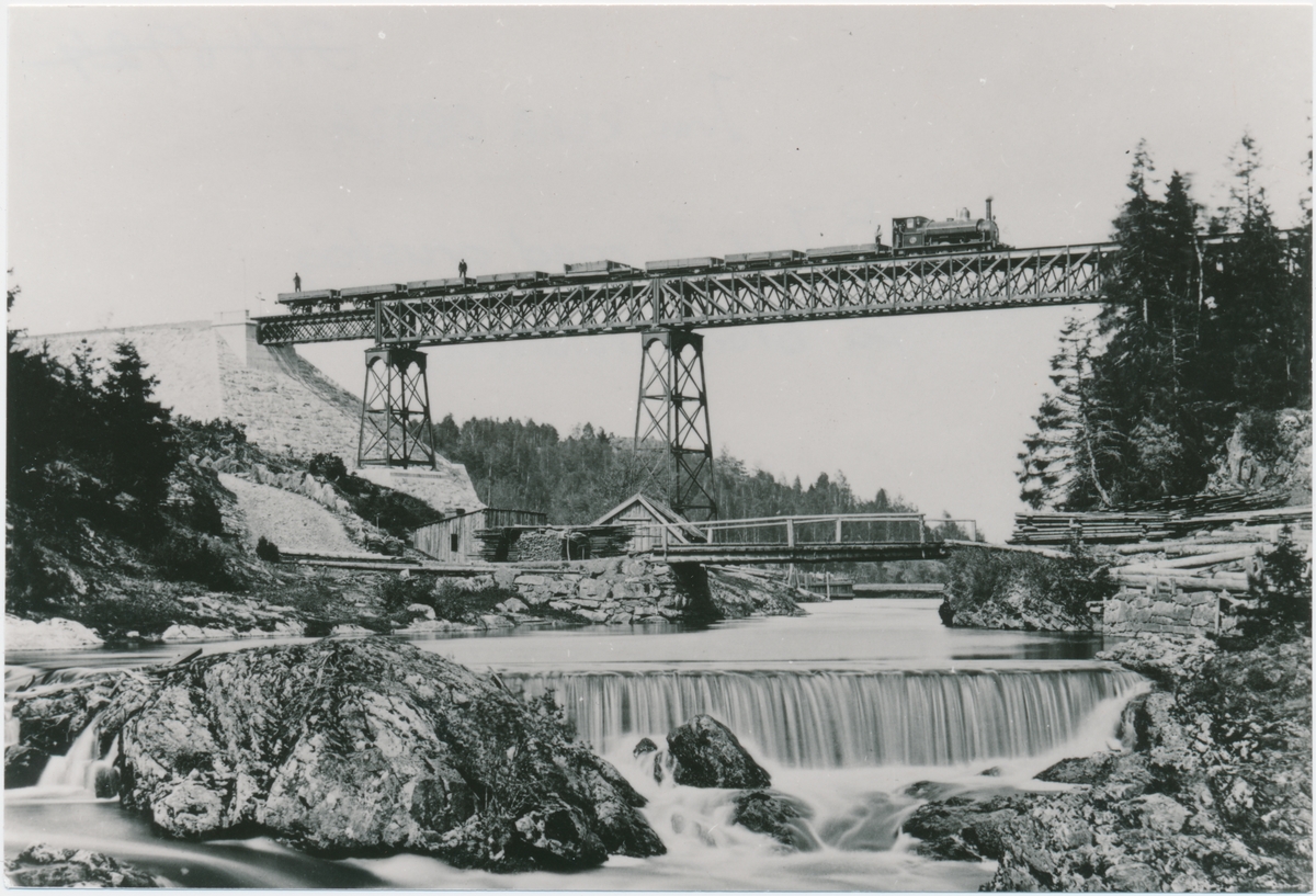 Titel: Bergslagernas Järnväg, BJ U 3 med gruståg på bron över Storån vid Velanda.