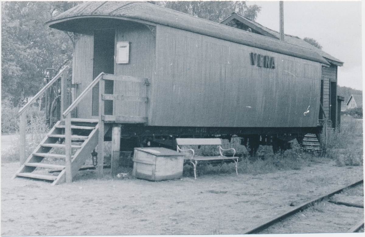 Före detta tjänstevagn från Statens Järnvägar, SJ B3C 453, avställd och använd som provisorisk post och järnvägsstation i Vena.