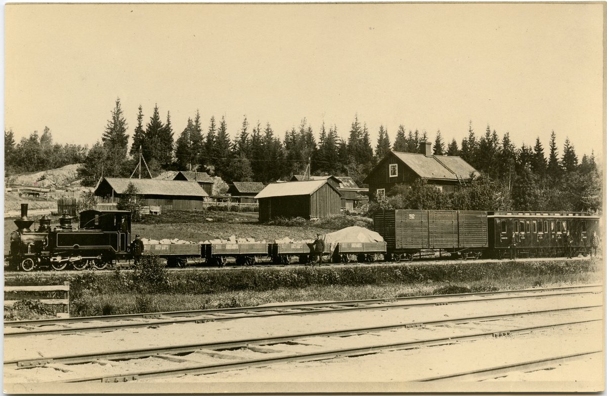 Bredsjö-Degerfors Järnväg, BDJ lok 5 med vagnar BDJ J 219, BDJ J 205, BDJ J 234, BDJ J 222 i Vikersvik. I förgrunden (NKJ) Nora - Karlskoga Järnvägs normalspår.