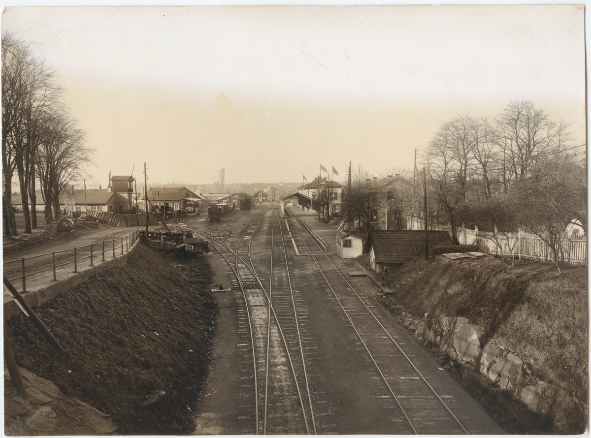 Vänersborgs station sedd från Edsgatans bro, över östra infarten till stationen.