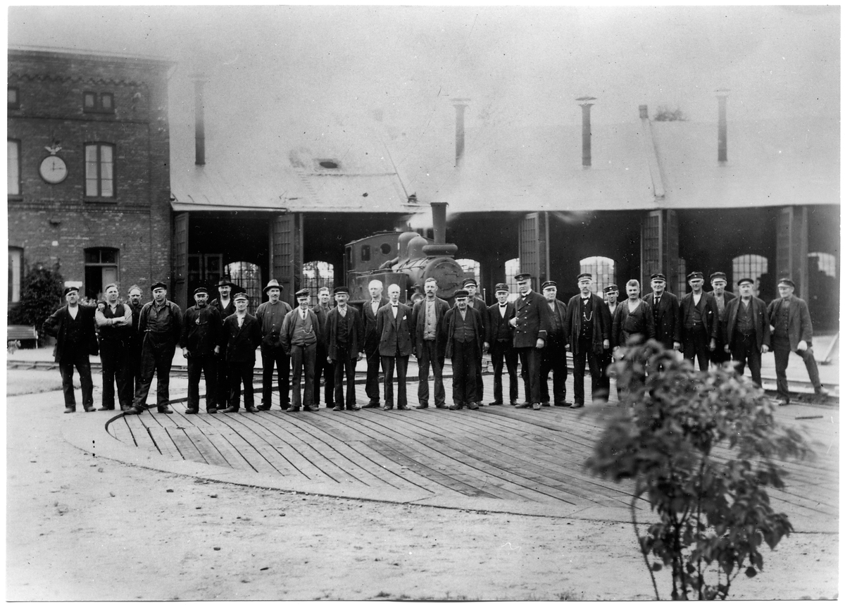 Titel: Personalen uppställd för fotografering framför lokstallet.