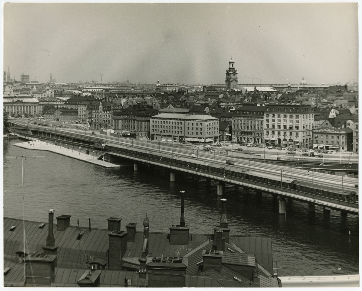 Centralbron sedd från Söder mälarstrand. Riddarholmen i bakgrunden. Linjen mellan Stockholms C och Mälarstrand.