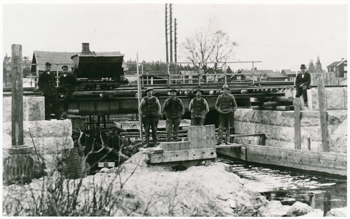 Titel: Arbete med dubbelspår på bro. Banvakt Stark längst till vänster i bild.