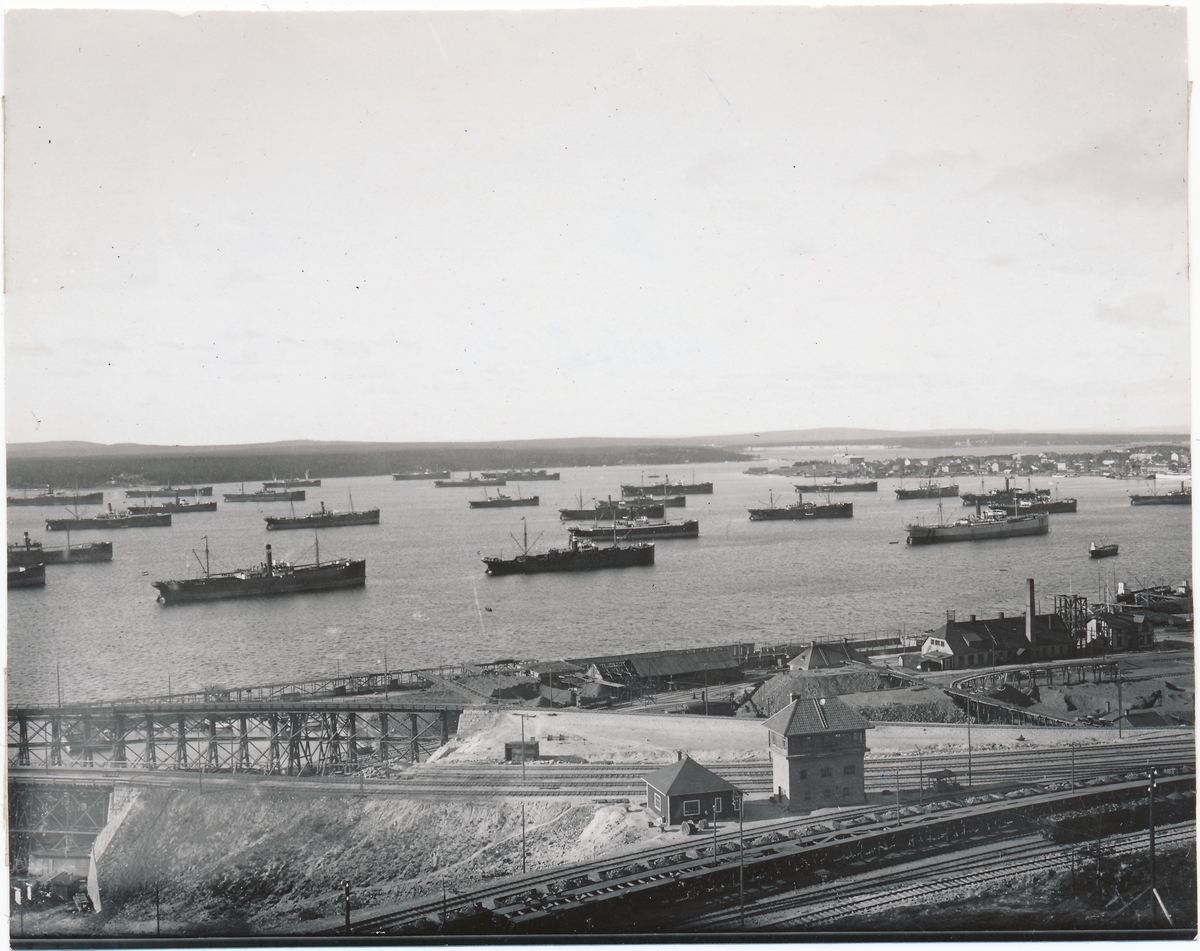 Titel: Fyrtio tyska malmångare förankrade i hamnen.