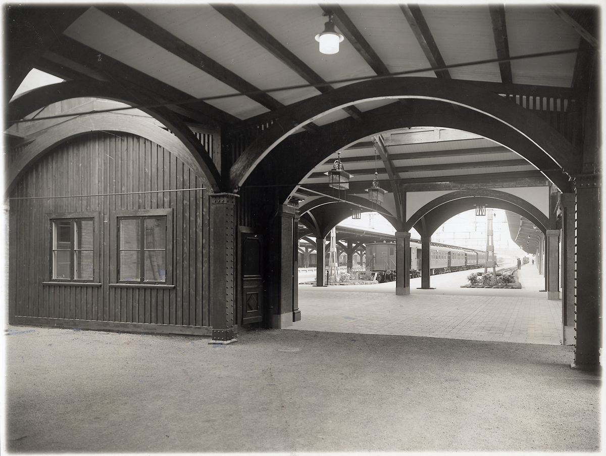 Titel: Göteborgs centralstation. Utsikt från truckhallen mot plattformarna för avgående tåg