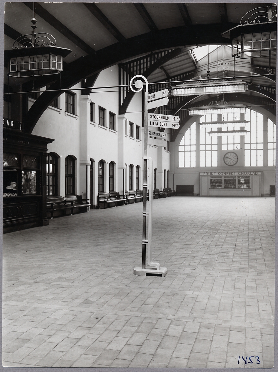 Avgångshallen, Göteborgs centralstation. En modell för vägvisare är uppställd