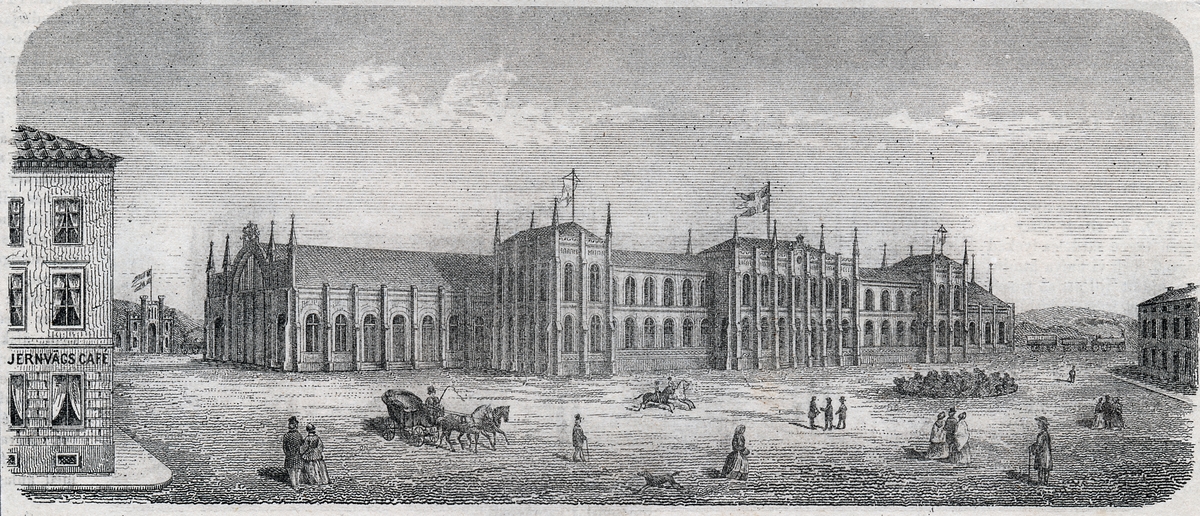 Bangården i Göteborg, litografi år 1857. Foto ur illustrerad tidning 1859