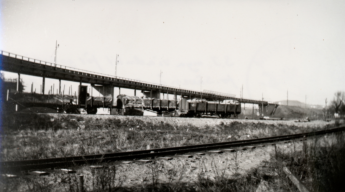 Statens Järnvägar, SJ nya viadukt för godståg från Sävenäs rangerbangård till och från Bohusbanan. Godsvagnar vid VGJ omlastningsmagasin. Hitersta spåret VGJ. Huvudspår Olskroken-Lärje.