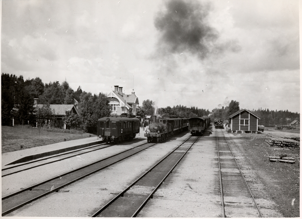 Hestra station på 1930-talet. Göteborg-Borås järnväg, GBJ motorvagn 51 samt ett okänt Borås-Alvesta Järnväg, BAJ ånglok.