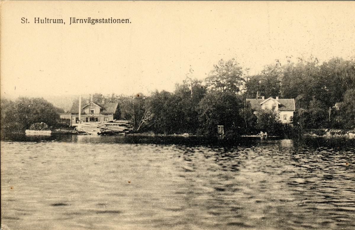 Titel: Stationshuset till vänster och ett bostadshus till höger.
