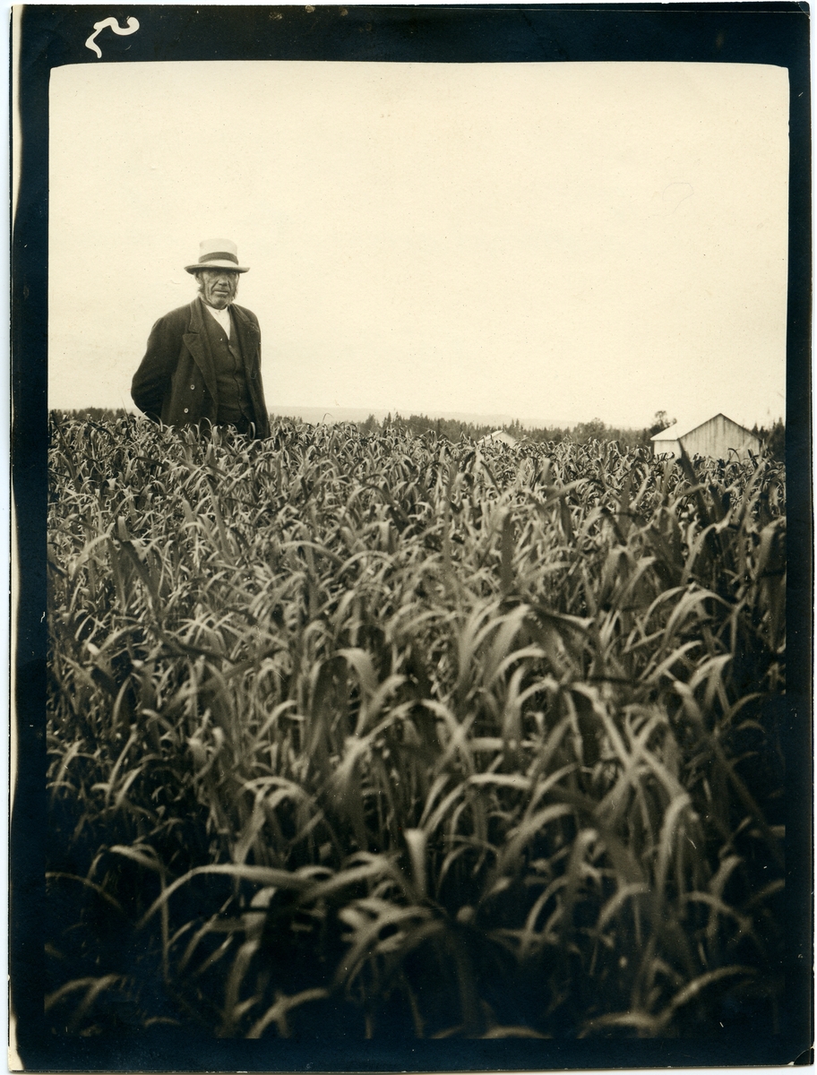Titel: Lantbrukare Jöns Larsson står i en spannmålsodling på mossmark i Sikås.