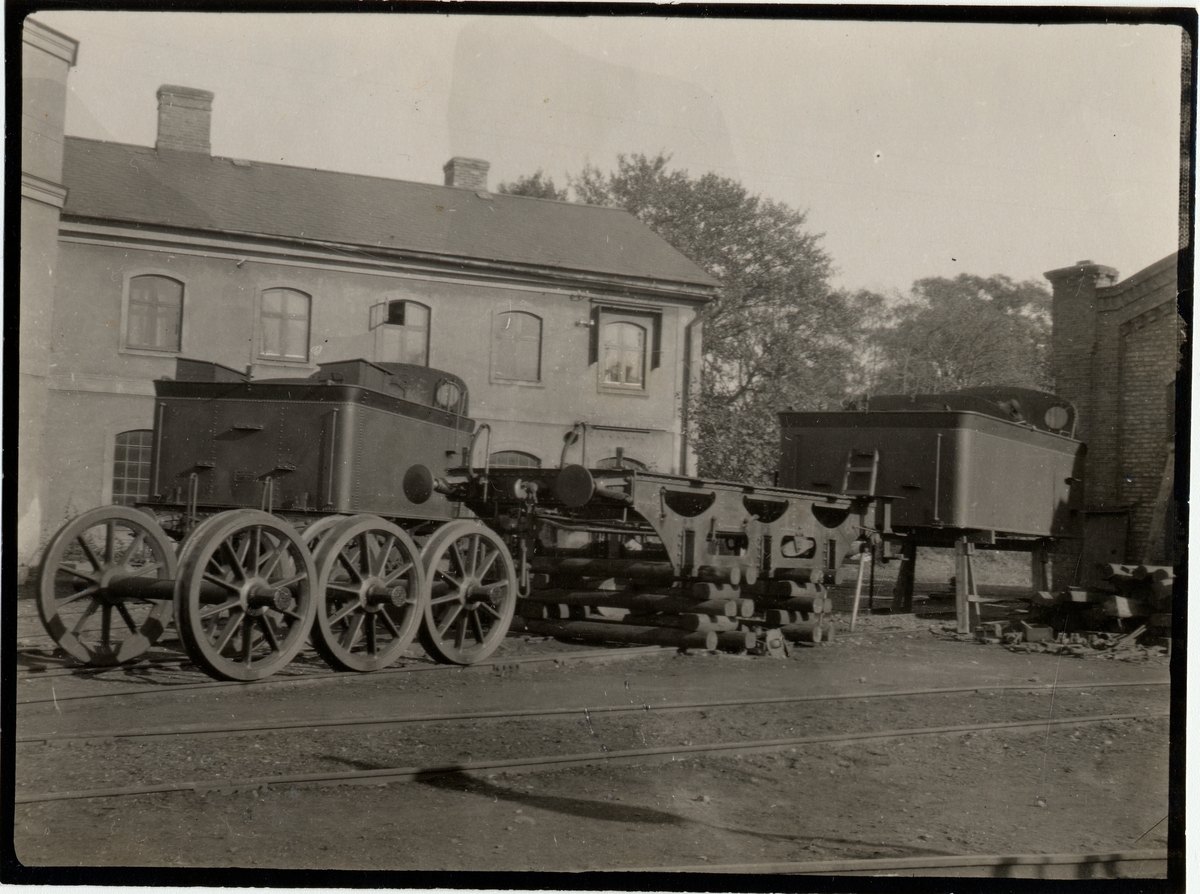 Kalmar. Hjulaxlar, ramverk för treaxlig tender samt två tenderkorgar utanför lokstallet.
