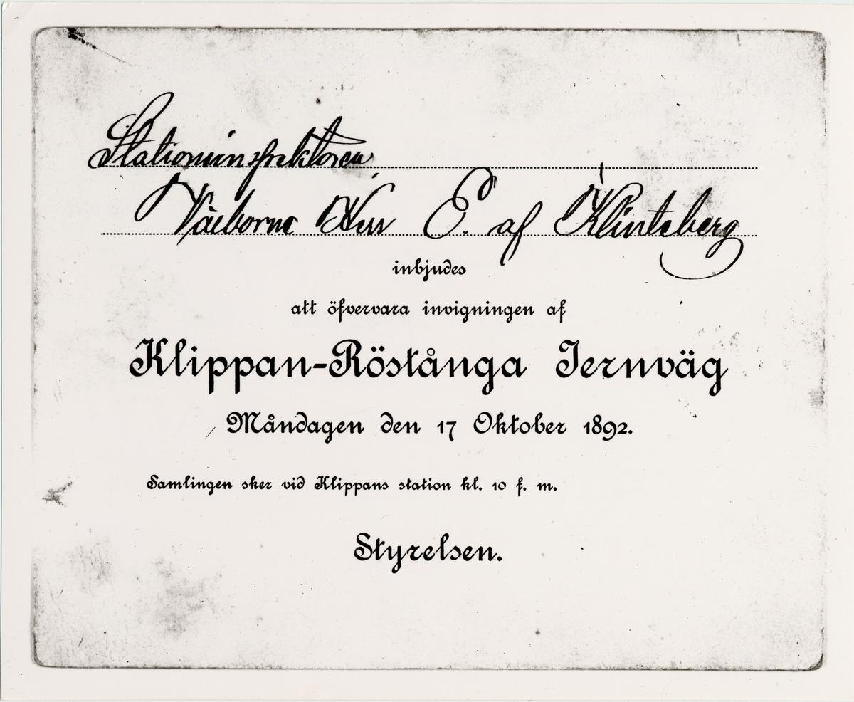 Titel: Inbjudningskort till Klippan-Röstånga Järnvägs invigning.