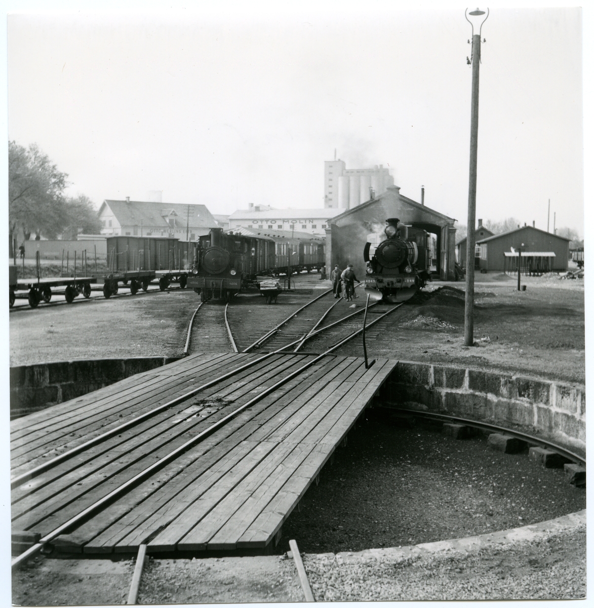 Titel: Påeldat lok framför lokstall. Personal utför service på loket.