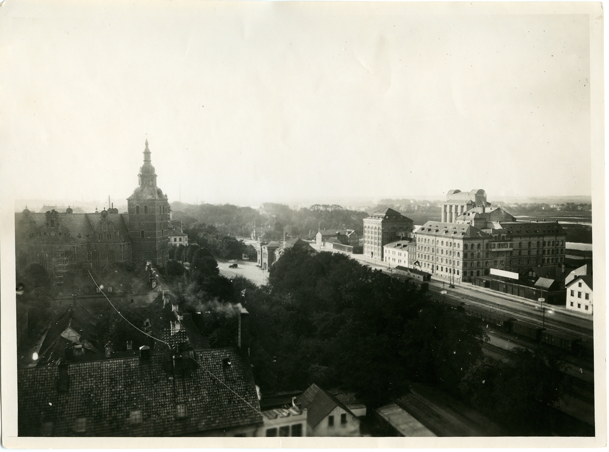 Titel: Vy över Kristianstad man ser trefaldighets kyrkan som är mittemot stationshuset.