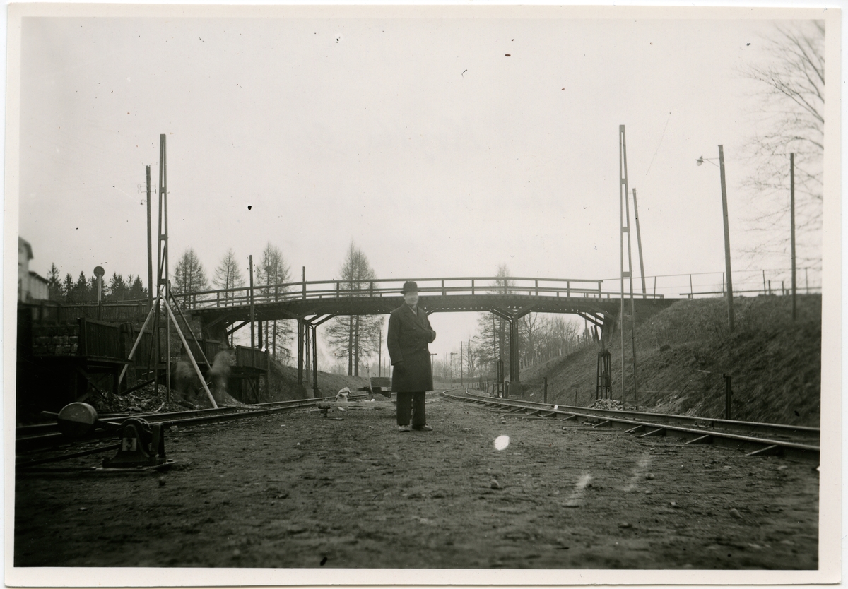 Ledningsstolpen till höger den första som restes på bangården. Gamla bron över Södra Dalarnas Järnväg och Krylbo-Norbergs Järnväg.