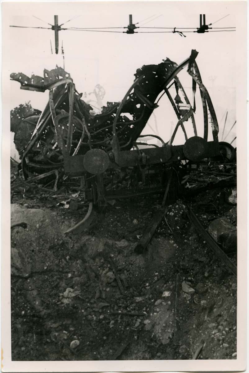 Krylbo-olyckan. Krater, förvridna vagnsdelar och räls.