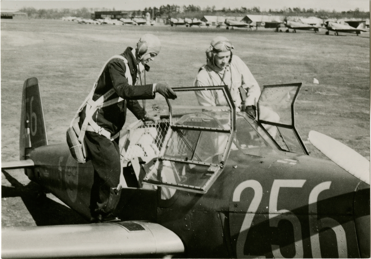 Ljungbyhed regemente, lärare och elev före flygning vid F5. Flygplan SK25 byggd i Örnsköldsvik.