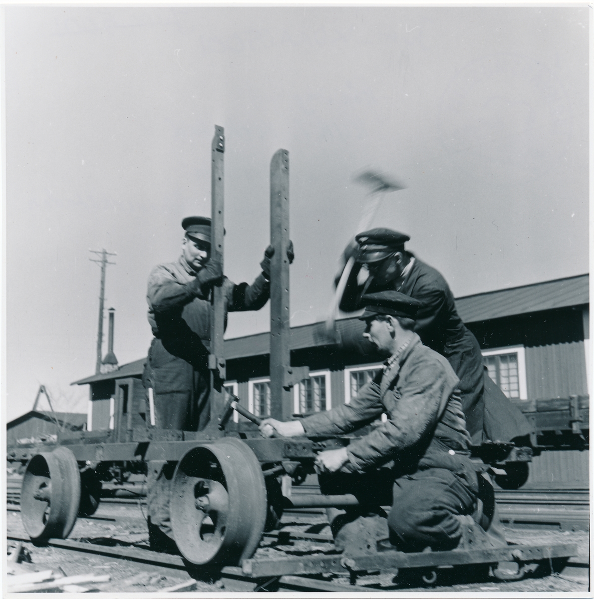 KURJs verkstad i skrotning av dressin. Personal från vagnverkstaden. Målarverkstaden i bakgrunden. Verkstadsförman Harry Rydbergsläggar. Fredrikson och Målberg