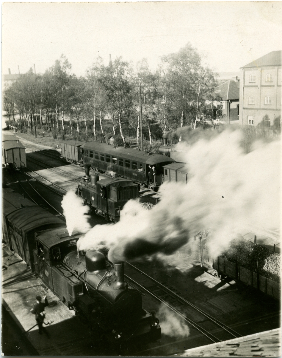 Titel: Utsikt över bangården 1927. Stationen anlades 1874. Tvåvånings stationshus