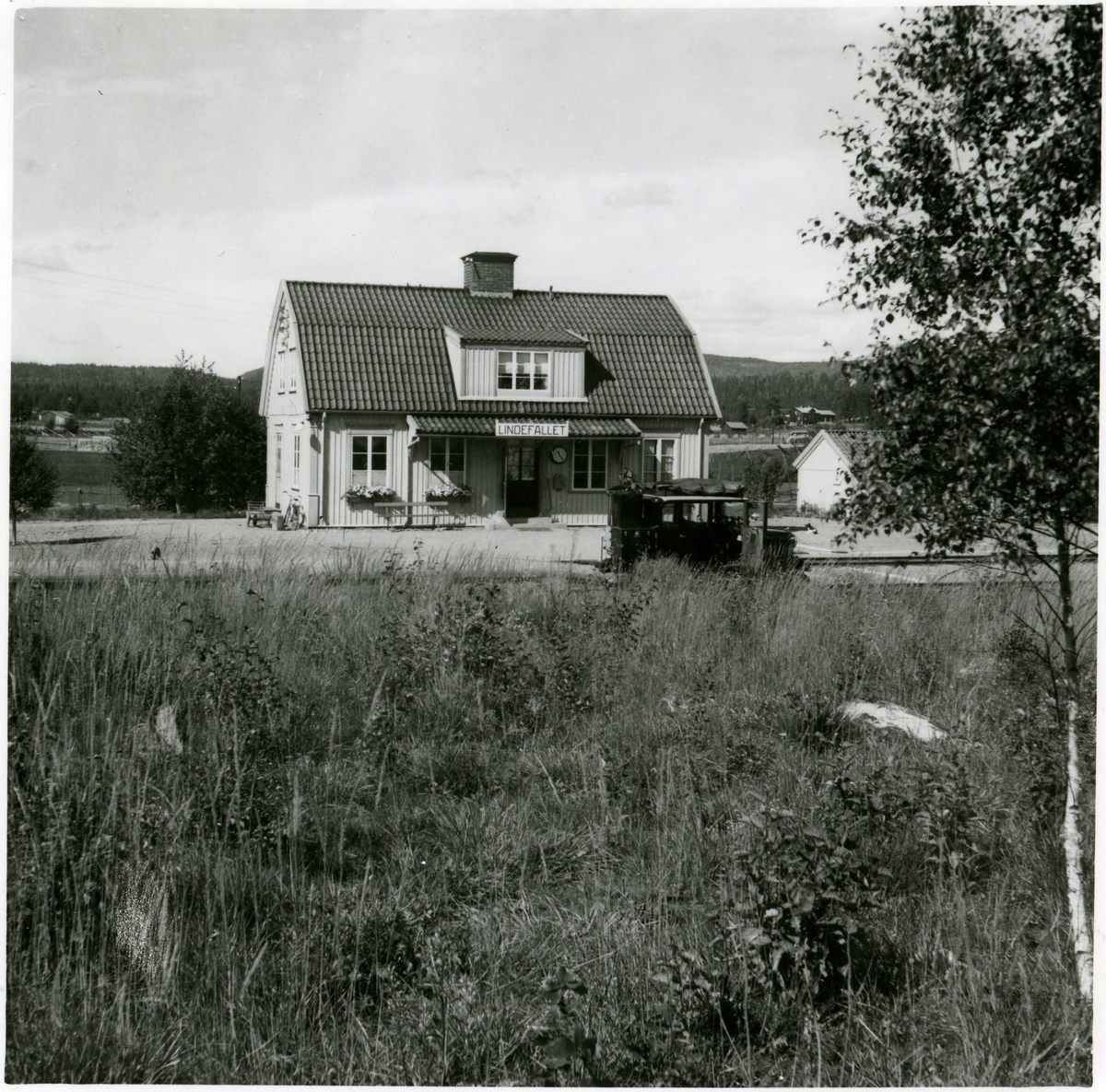 Titel: Lindefallet stationshus med motordressin vid plattform.