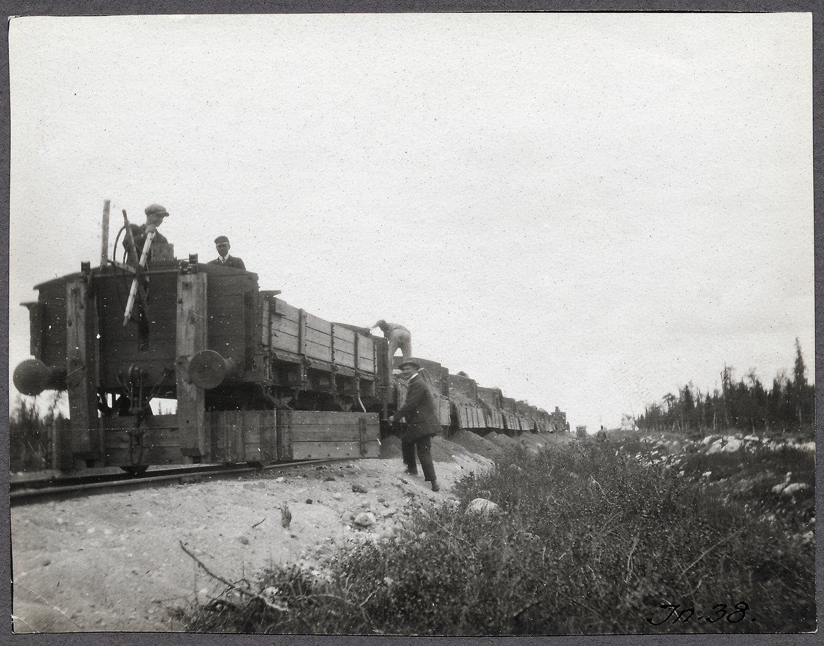 Titel: Användning av grussläpa vid bellastningsarbetet sommaren 1912. Gällivare-Porjus.