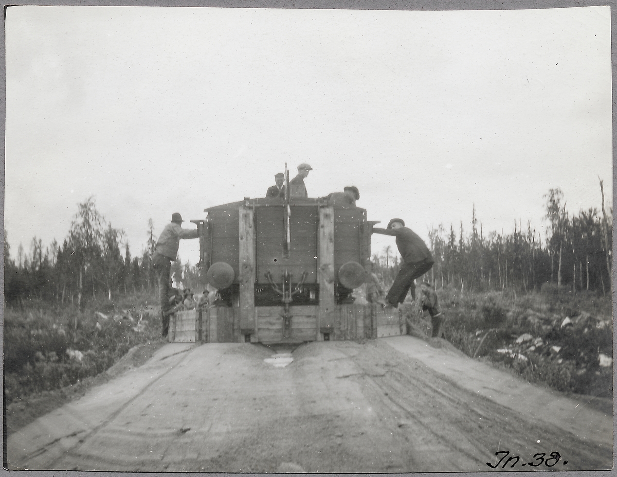 Titel: Användning av grussläpa vid bellastningsarbetet sommaren 1912. Gällivare-Porjus.